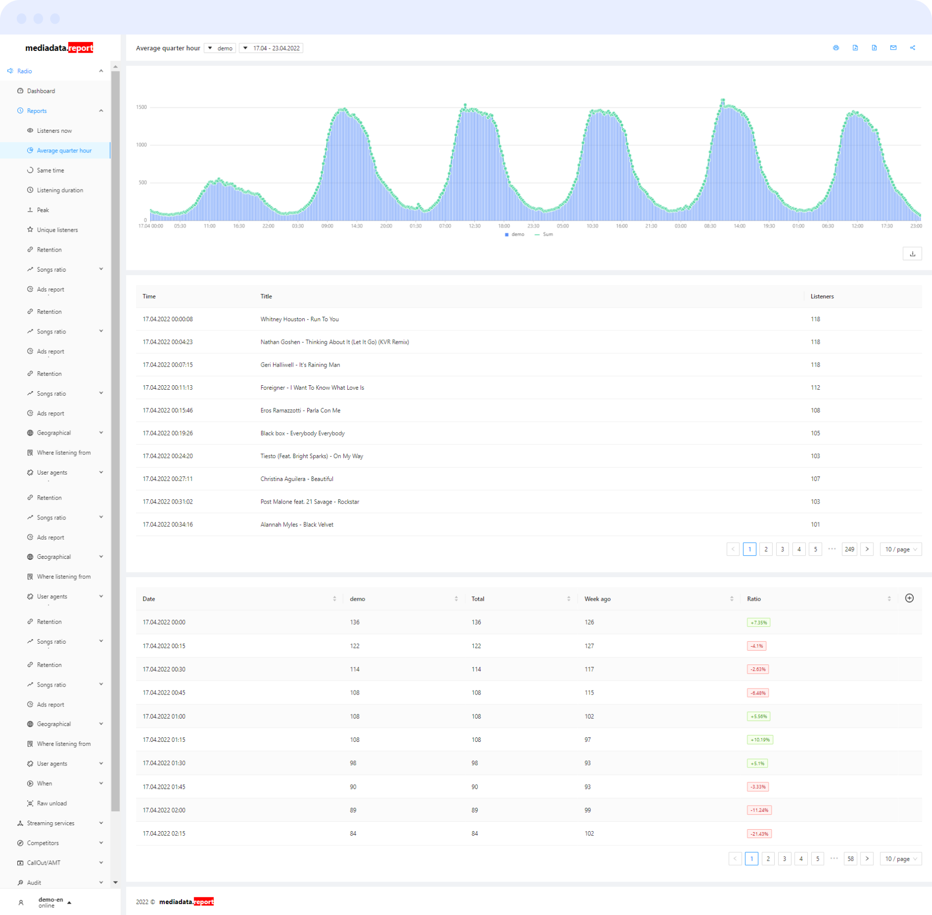 That is a generally accepted report that shows the involvement of listeners in a particular 15-minute segment of the broadcast. For example, in the comparison mode, you can select two days when the same program was on the air and then compare the audience engagement.