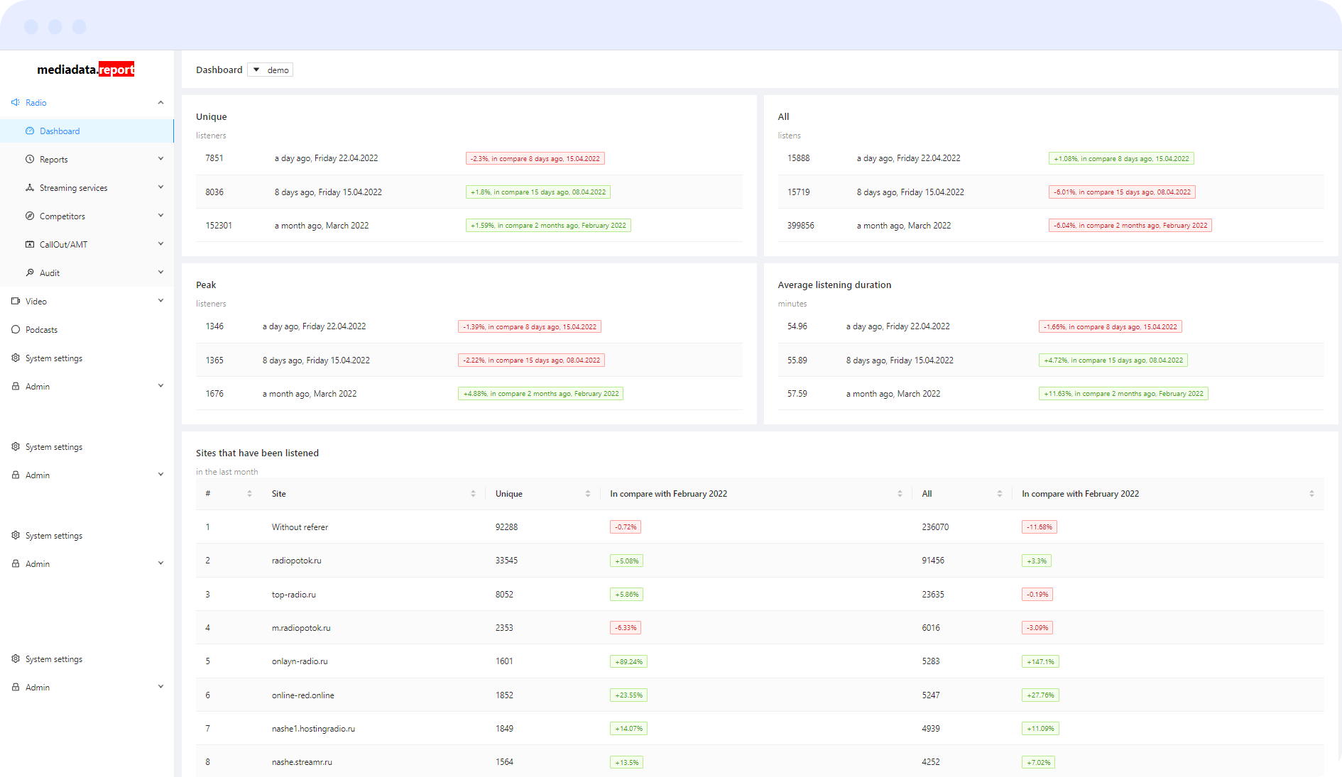 - listening sites (listening channels), according to each channel has a number of unique listeners, total auditions for this channel and comparison with last month