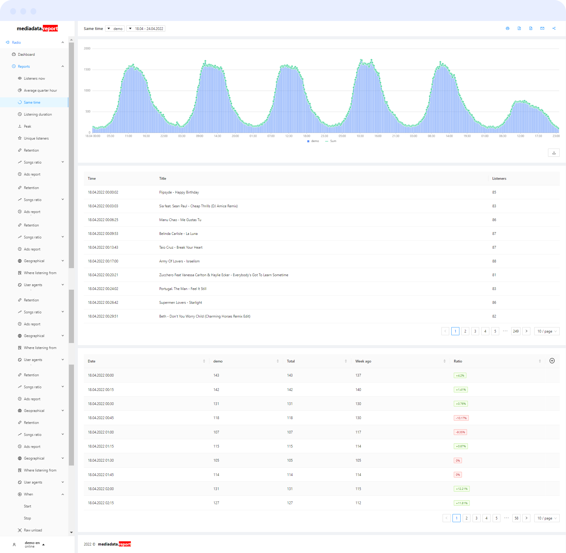 The report shows the total number of listeners of the selected radio stations in each 15-minute interval, while the value includes all listeners who listened to the broadcast in this interval, no matter what time interval.