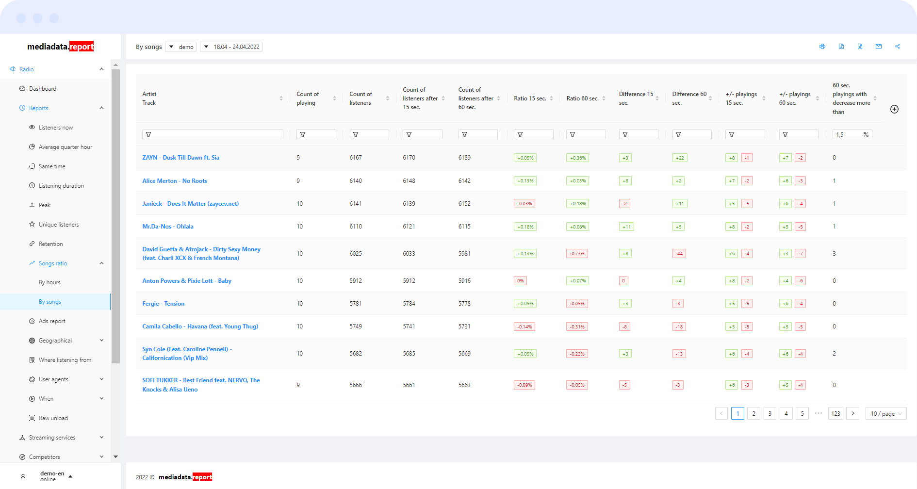 For each of the elements, the name and performer are indicated, the number of airings of the element, the total number of listeners at the beginning of playback, 15 and 60 seconds after the start for all the outputs of the element, as well as the ratio of the number of listeners after 15 and 60 seconds to the number of listeners at the beginning, the difference in the number of listeners after 15 and 60 seconds, the number of airings with a gain / loss of the number of listeners after 15 and 60 seconds.